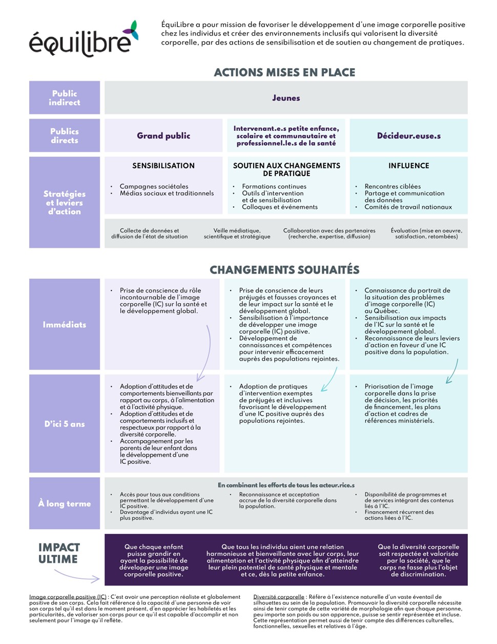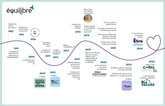 Au fil du temps, ÉquiLibre cesse d'offrir des services directs à la population pour se consacrer à la formation d'agent.e.s multiplicateur.rice.s et à la sensibilisation du grand public au moyen de campagnes visant à remettre en question les normes sociales de minceur, à dénoncer les comportements malsains qui en découlent et à promouvoir la diversité corporelle.