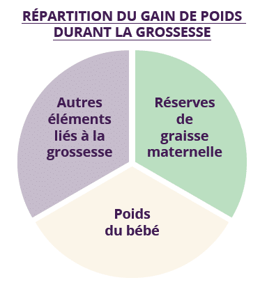 D’abord, il est important de comprendre que la prise de poids est normale et souhaitable durant la grossesse. De plus, oui, vous vous faites certaines réserves essentielles de graisse maternelle, mais plusieurs autres éléments viennent expliquer le chiffre qui augmente sur la balance : le poids du bébé, l’augmentation de la quantité de sang qui circule dans votre corps, l’augmentation du poids et de la taille de votre placenta et de votre utérus, etc. Ce schéma représente la répartition du gain de poids durant la grossesse.