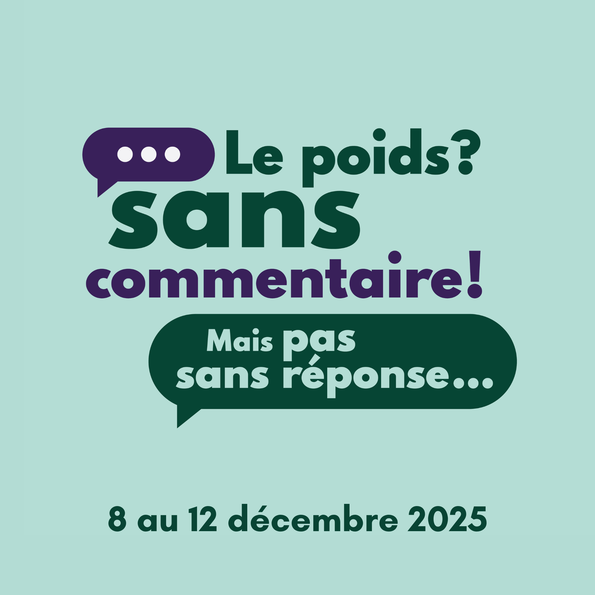 Pour la 14e édition de la campagne Le poids? Sans commentaire!, qui aura lieu du 8 au 12 décembre, ÉquiLibre souhaite outiller la population à réagir aux commentaires sur le poids et l’apparence, qu’ils soient adressés à soi-même ou aux autres.
